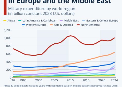 Nakon ruske invazije na Ukrajinu, vojna potrošnja u Europi je porasla, i to znatno naglije nego u Aziji, gdje su proračuni relativno postojano rasli dok su gospodarstva na kontinentu...