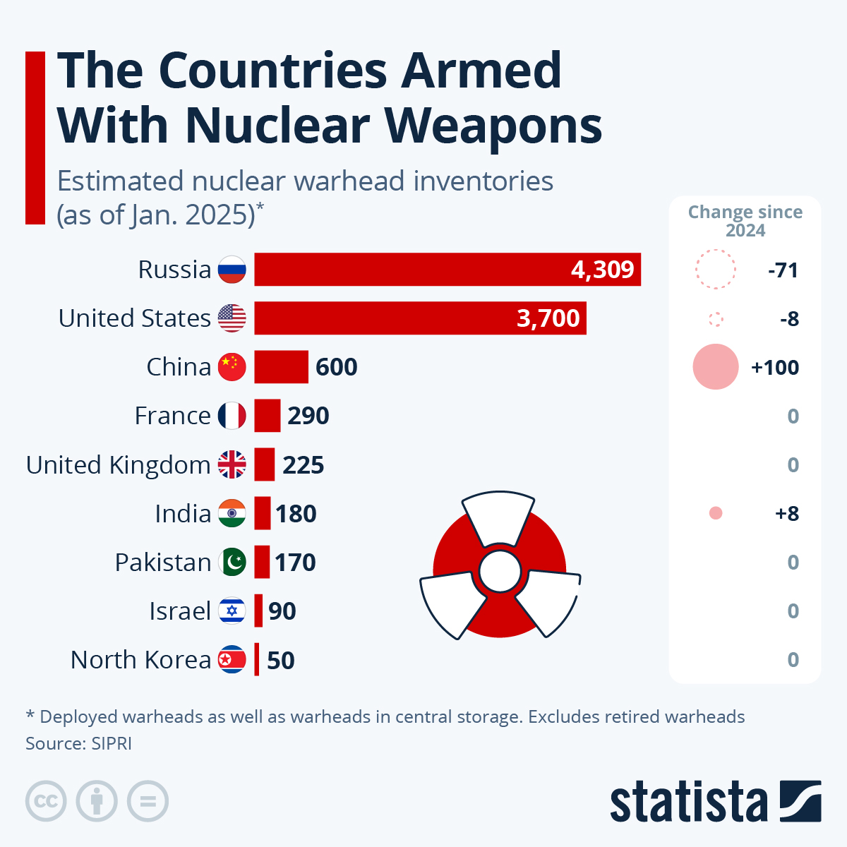 Kao što pokazuje sljedeći grafikon, Kina je svom arsenalu od siječnja 2024. dodala 100 nuklearnih bojevih glava, povećavši se s 500 na 600. To je prema podacima instituta za istraživanje mira SIPRI. Indija je također proširila svoj arsenal s osam novih bojevih glava, dovodeći ukupnu brojku u zemlji na procijenjenih 180 komada oružja.