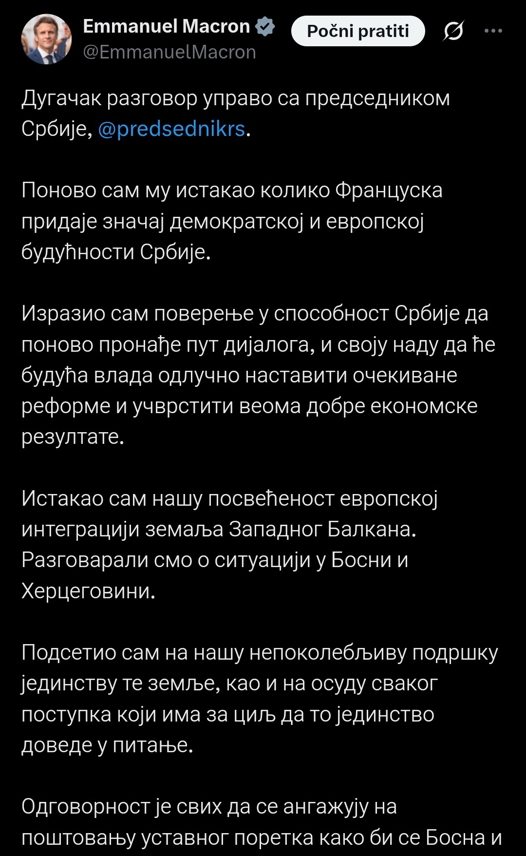 – Dugačak razgovor upravo s predsjednikom Srbije. Ponovo sam mu istaknuo koliko Francuska pridaje značaj demokratskoj i europskoj budućnosti Srbije. Izrazio sam povjerenje u sposobnost Srbije da ponovo pronađe put dijaloga, i svoju nadu da će buduća vlada odlučno nastaviti očekivane reforme i učvrstiti veoma dobre ekonomske rezultate, naglasio je.
