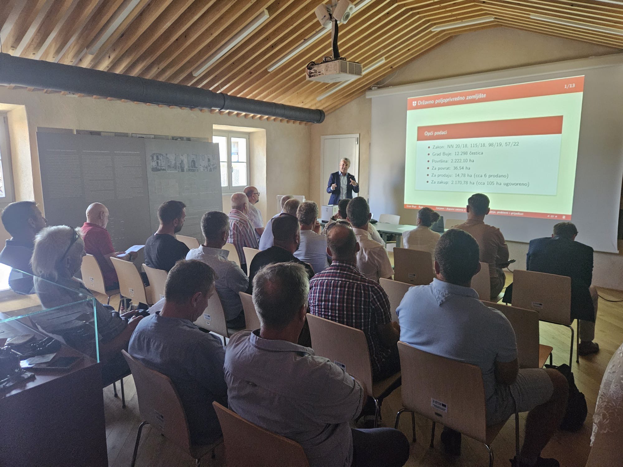 Gradonačelnik Vižintin otvorio je prvu panel raspravu na temu Izmjena i dopuna Zakona o državnom poljoprivrednom zemljištu te predstavio stanje na području Grada Buja: 12.298 čestica ukupne površine 2.222,10 ha, od čega je 2.170,78 ha predviđeno za zakup, 14,78 ha za prodaju, a 36,54 ha za povrat. Ugovoreno je tek oko 105 ha zakupa, dok je dio zemljišta neobrađen zbog usitnjenih, obraslih i nepristupačnih čestica, miješanog vlasništva i tehničkih ograničenja.